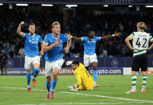 Napoli earned their first win of the campaign with a 2-1 victory over Sporting Lisbon. Rasmus Hoejlund scored both goals for Napoli, while Luis Suarez equalized from the penalty spot for Sporting.